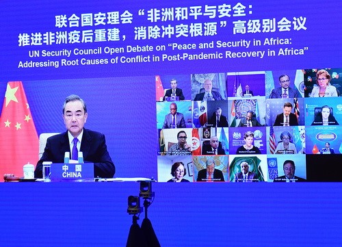 Chinese State Councilor and Foreign Minister Wang Yi chairs the UN Security Council open debate on “Peace and Security in Africa: Addressing Root Causes of Conflict in Post-Pandemic Recovery in Africa” via video link on May 19, 2021. (Photo from the website of China’s Ministry of Foreign Affairs)