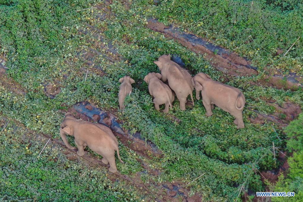Aerial photo taken on June 19, 2021 shows a herd of wild Asian elephants in Dalongtan Township of Eshan County, Yuxi City, southwest China's Yunnan Province. From June 18 to June 19, China's famous herd of wandering elephants has headed 3.09 km southwest and continued to linger in Dalongtan Township of Eshan County. An elephant that strayed 14 days ago was about 24.9 km away from the herd, and all the 15 elephants were safe and sound, according to the headquarters in charge of monitoring their migration. (Xinhua)