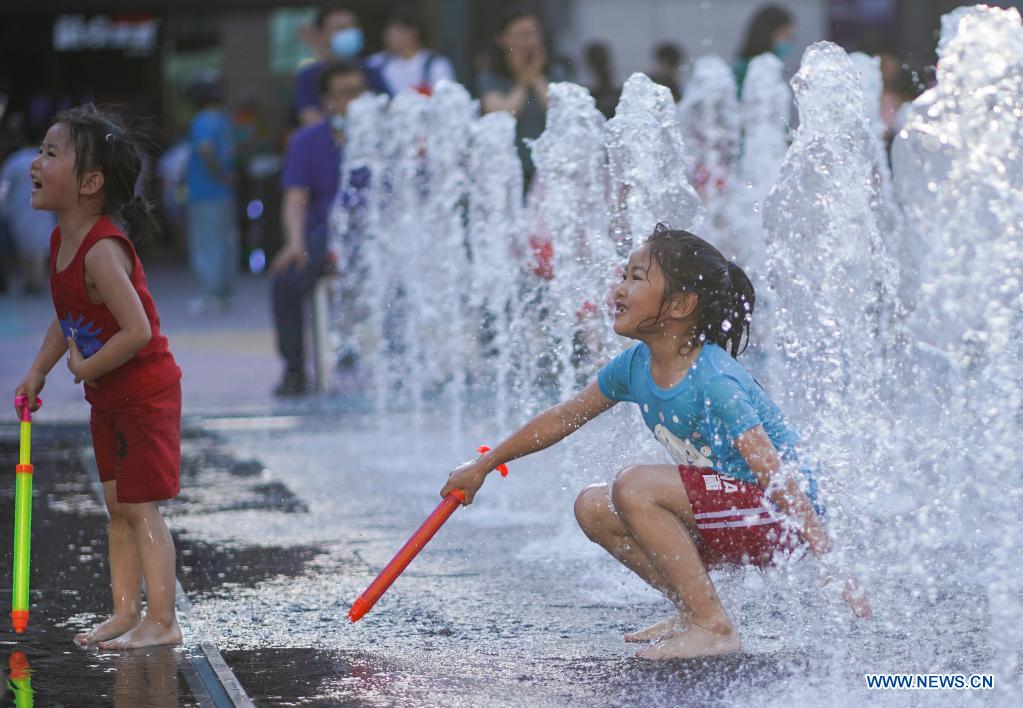 Children cool off at a fountain in Beijing, capital of China, June 20, 2021. (Xinhua/Chen Yehua)