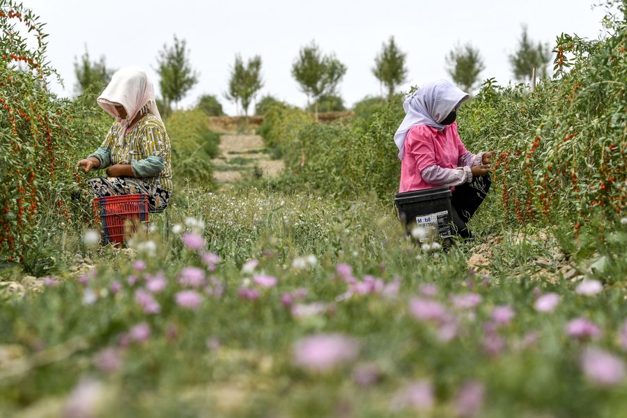Goji berry pickers work at fields in Zhongning County, northwest China's Ningxia Hui Autonomous Region, June 30, 2020. (Xinhua/Feng Kaihua)