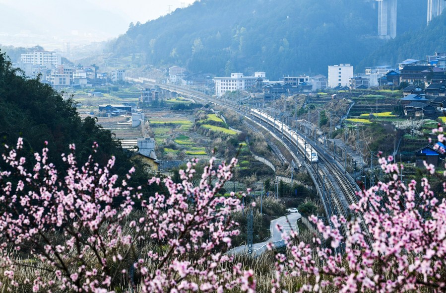 A bullet train passes by the fields dotted with blossoming plants in Luoxiang Township of Congjiang County, southwest China's Guizhou Province, Feb. 23, 2021. (Xinhua/Yang Wenbin)