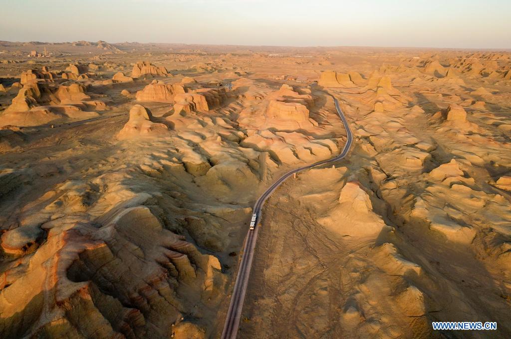Aerial photo taken on June 21, 2021 shows a view of a Yardang scenic area in Urho District of Karamay, northwest China's Xinjiang Uygur Autonomous Region. (Xinhua/Gu Yu)