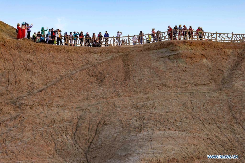 Photo taken on June 21, 2021 shows visitors enjoying sunset at a Yardang scenic area in Urho District of Karamay, northwest China's Xinjiang Uygur Autonomous Region. (Xinhua/Hu Huhu)