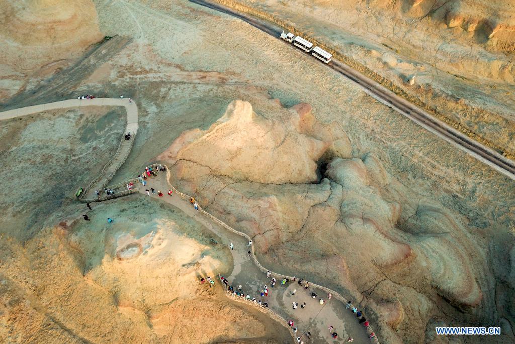 Aerial photo taken on June 21, 2021 shows a view of a Yardang scenic area in Urho District of Karamay, northwest China's Xinjiang Uygur Autonomous Region. (Xinhua/Gu Yu)