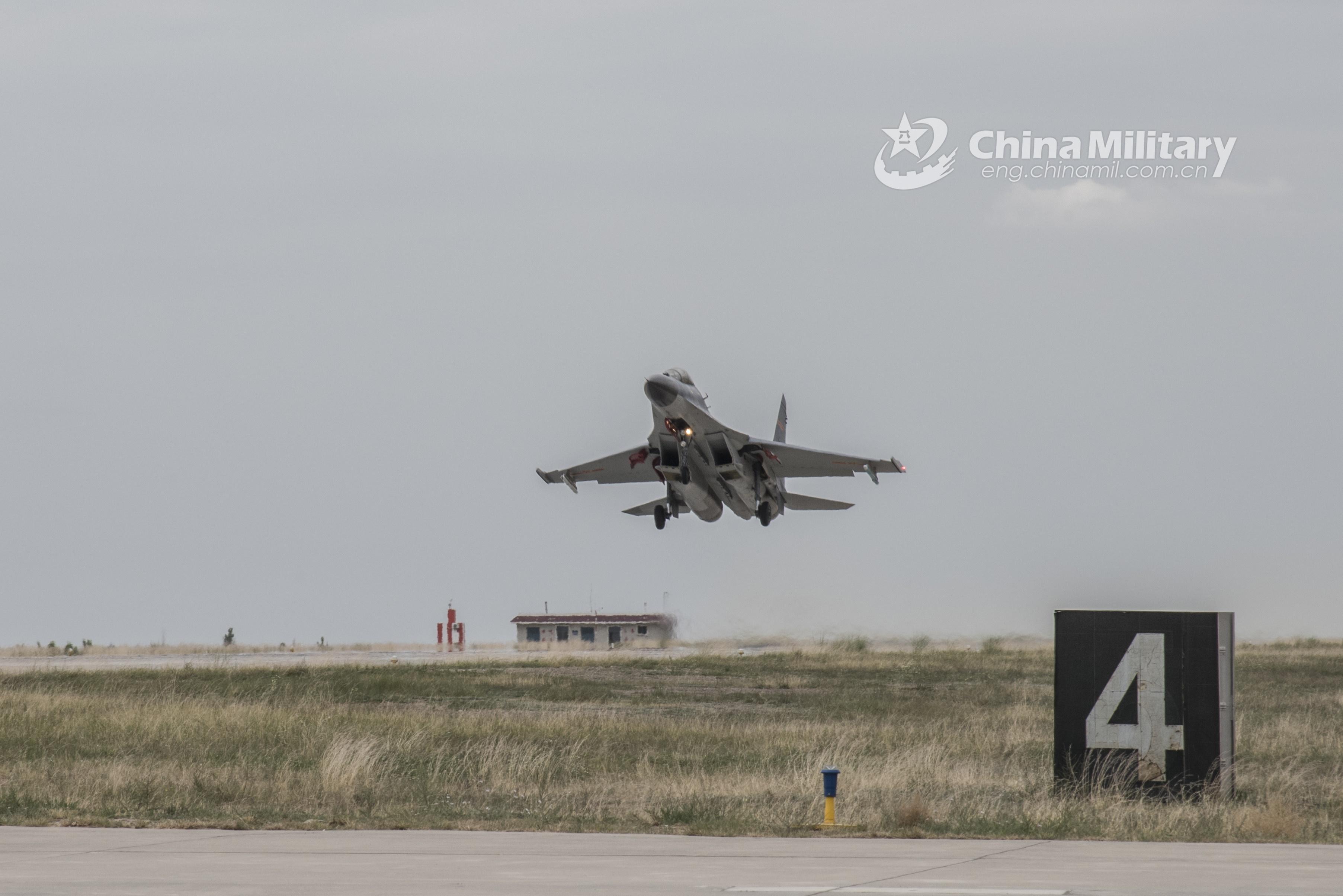 A fighter jet attached to an aviation brigade of the air force under the PLA Western Theater Command takes off from the runway during a flight training exercise on June 10, 2021. (eng.chinamil.com.cn/Photo by Cao Yukun)