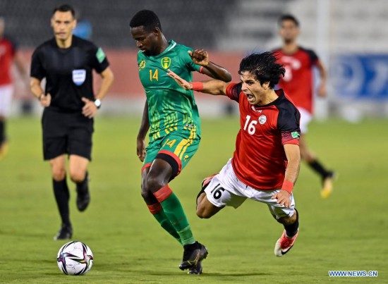 Dellah Yaly (L) of Mauritania vies with Nasser Al Gahwashi of Yemen during the FIFA Arab Cup Qatar 2021 qualifying round football match between Mauritania and Yemen in Doha, Qatar, June 22, 2021. (Photo by Nikku/Xinhua)