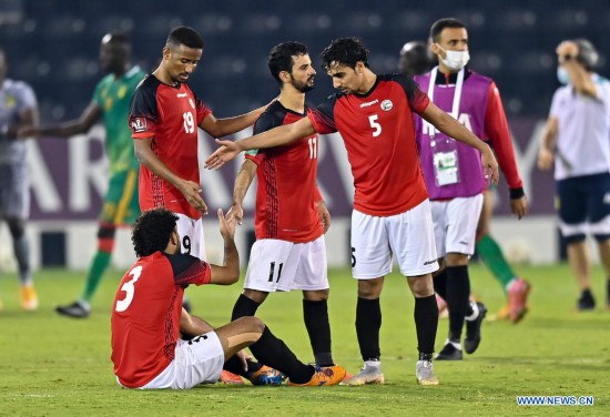 Players of Yemen react after losing the FIFA Arab Cup Qatar 2021 qualifying round football match between Mauritania and Yemen in Doha, Qatar, June 22, 2021. (Photo by Nikku/Xinhua)