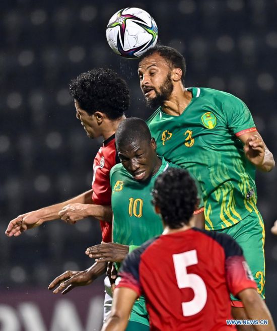Adama Ba (2nd L) and Houssen Abderrahmane (R) of Mauritania vies with Manaf Saad (L) of Yemen during the FIFA Arab Cup Qatar 2021 qualifying round football match between Mauritania and Yemen in Doha, Qatar, June 22, 2021. (Photo by Nikku/Xinhua)