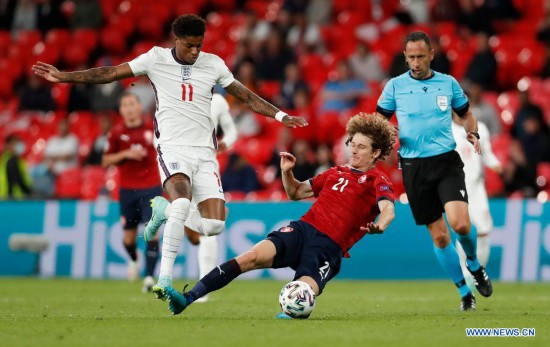England's Marcus Rashford (L) vies with Czech Republic's Alex Kral during the Group D match between England and the Czech Republic at the UEFA EURO 2020 in London, Britain, on June 22, 2021. (Xinhua/Han Yan)