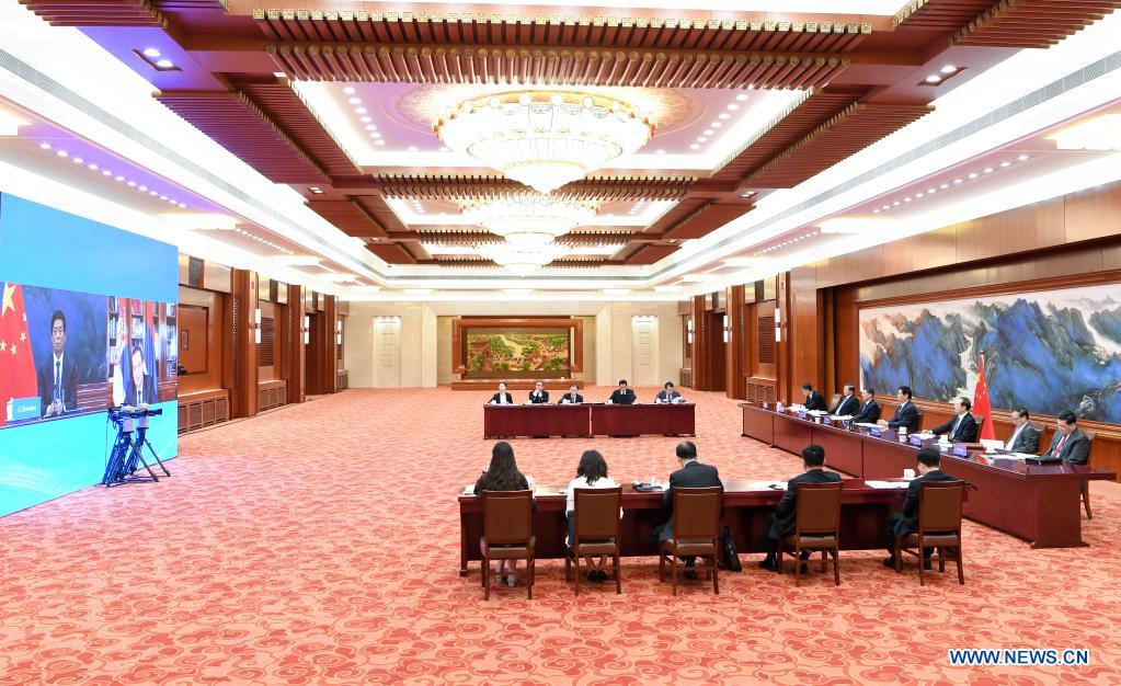 Li Zhanshu, chairman of the National People's Congress (NPC) Standing Committee, holds talks with Serbian National Assembly Speaker Ivica Dacic via video link in Beijing, capital of China, June 22, 2021. (Xinhua/Zhang Ling)