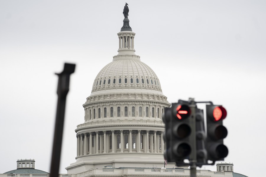 Photo taken on May 28, 2021 shows the U.S. Capitol building behind traffic lights in Washington, D.C., the United States. (Xinhua/Liu Jie)