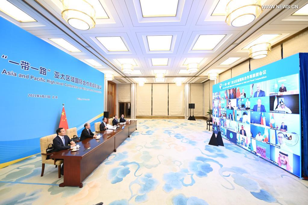 Chinese State Councilor and Foreign Minister Wang Yi presides over the Asia and Pacific High-level Conference on Belt and Road Cooperation via video link in Beijing, capital of China, June 23, 2021. (Xinhua/Li Xiang)