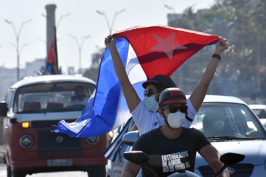People take part in a caravan demanding the lifting of the six-decades U.S. embargo in Havana, Cuba, on March 28, 2021. (Xinhua/Zhu Wanjun)
