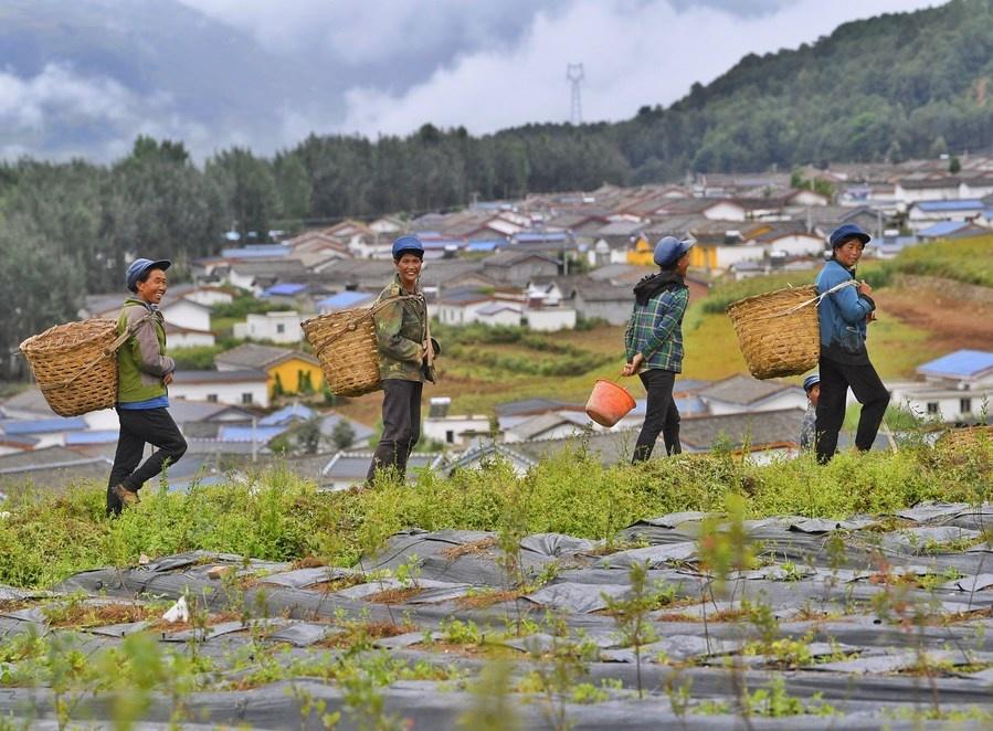 Women walk to a blueberry planting base for work at Laoji Village of Butuo County in Liangshan Yi Autonomous Prefecture, southwest China's Sichuan Province, Aug. 13, 2020. (Xinhua/Liu Kun)