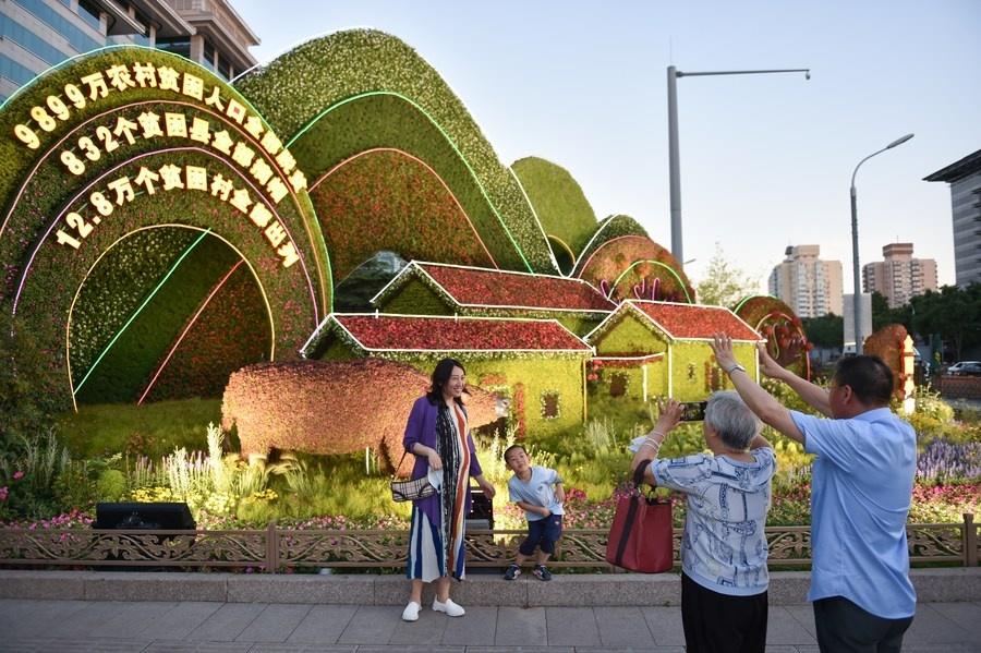 People pose for photos with flower decorations set up along Chang'an Avenue in Beijing, capital of China, June 19, 2021. (Xinhua/Chen Zhonghao)