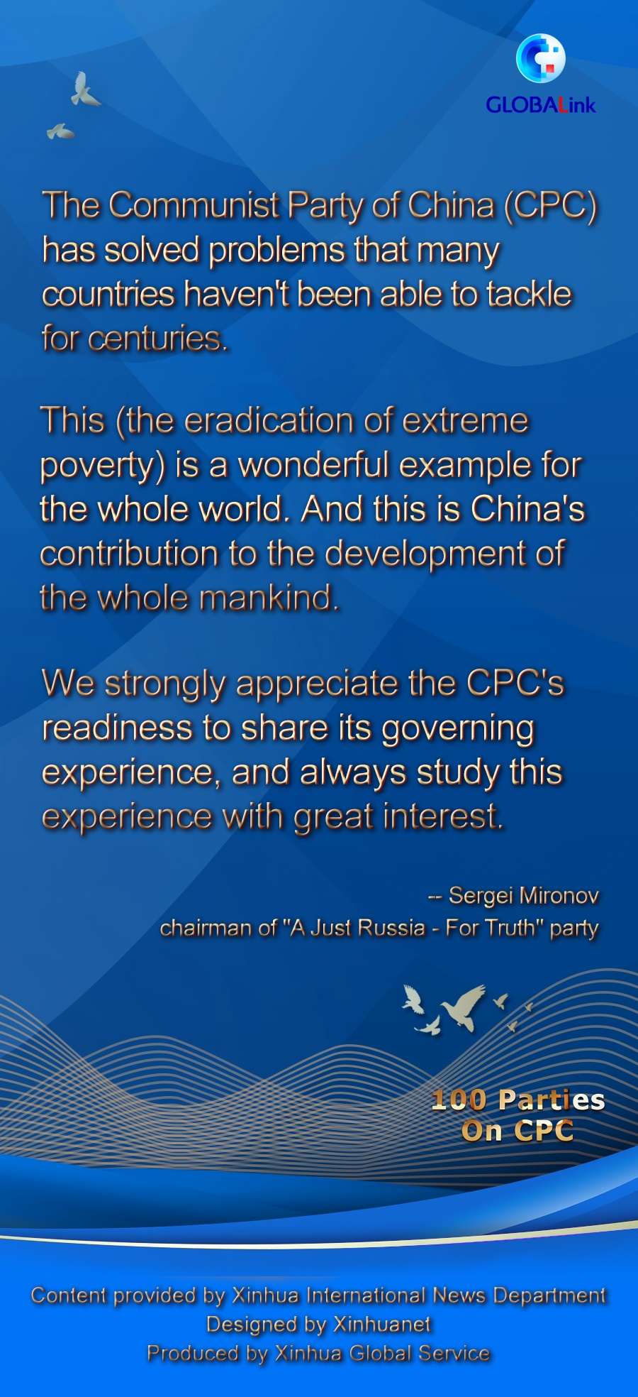 MOSCOW, June 24 (Xinhua) -- The Communist Party of China (CPC) has solved problems that many countries haven't been able to tackle for centuries, Sergei Mironov, chairman of "A Just Russia - For Truth" party, has said.