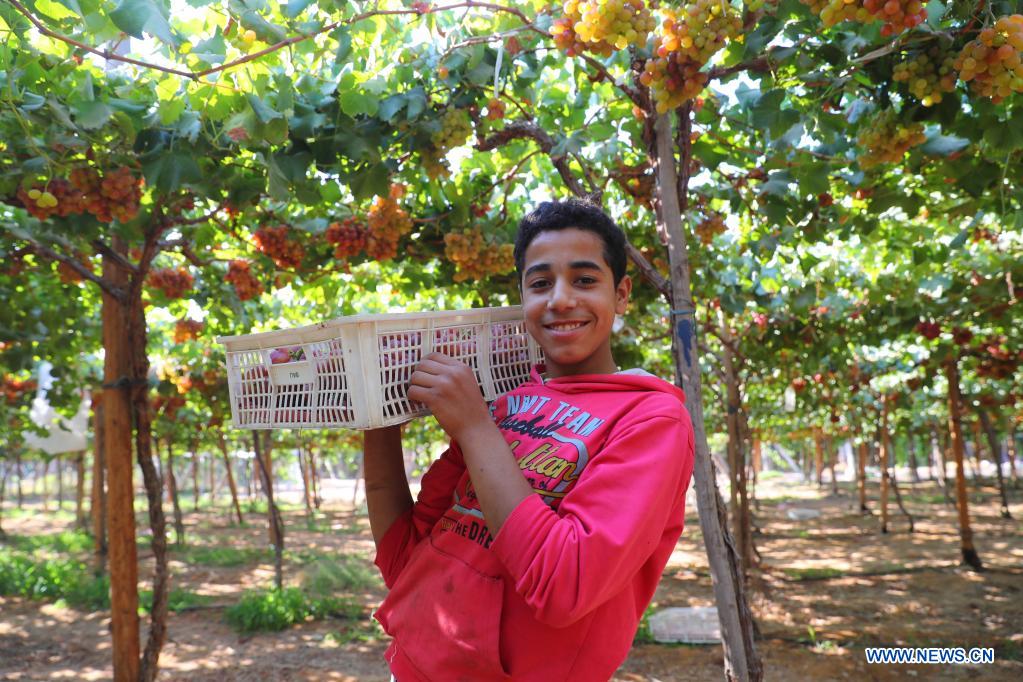 A worker poses for a photo with a basket of grapes at a grape farm in Sadat city of Menoufia province, Egypt, June 14, 2021. At a vast grape farm in Sadat City of Menoufia province, north of Cairo, dozens of well-trained workers carefully harvested clusters of grapes dangling beneath the green leaves. (Xinhua/Sui Xiankai)