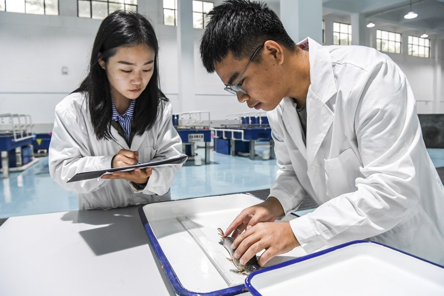 Yuan Ting (L), an expert in ecosystem-based fishery and rare fish species breeding, and a colleague collect research data at a fish hatchery of the Dateng Gorge water conservancy in south China's Guangxi Zhuang Autonomous Region, April 20, 2021. (Xinhua/Cao Yiming)