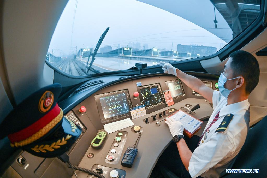 A staff confirms signals on train G8602, a Fuxing intelligent bullet train, at Chongqing West Railway Station in Chongqing, southwest China, June 25, 2021. The Fuxing intelligent bullet trains were put into operation on some railway lines on Friday. (Xinhua/Bao Liang)