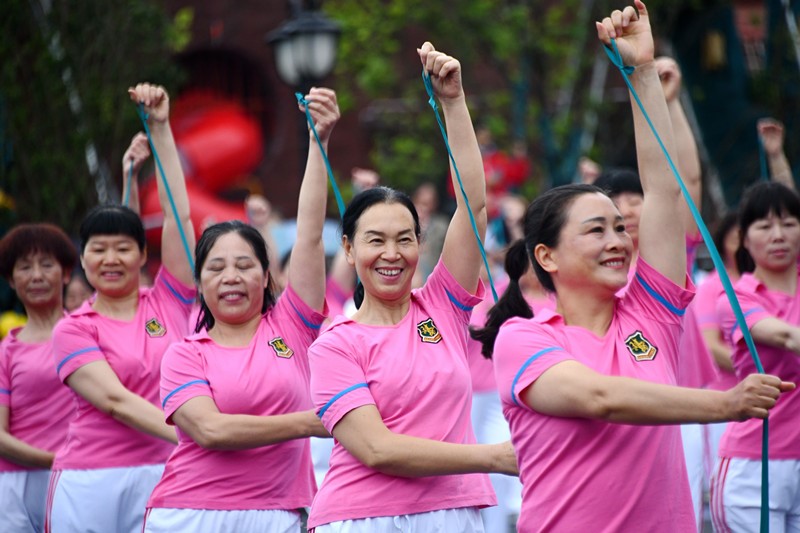 Senior citizens do fitness exercises in a park in Xianju county, Taizhou, east China's Zhejiang province, May 19, 2021. (People's Daily Online/Wang Huabin)