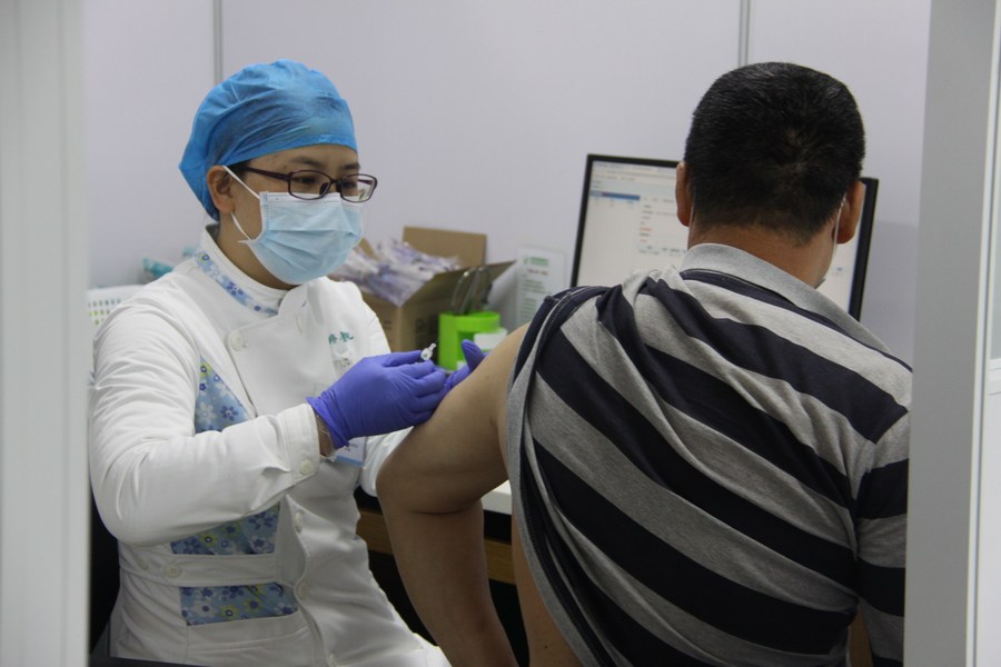 A medical worker injects COVID-19 vaccine to a man at the health management center in Panyu District of Guangzhou City, south China's Guangdong Province, Jan. 6, 2021. (Xinhua/Xu Hongyi)