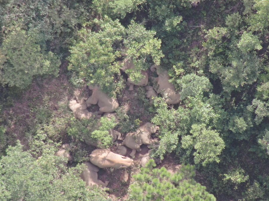 Drone photo provided by the provincial forest fire brigade shows the Asian elephants in Tadian Township under Yuxi City, southwest China's Yunnan Province on June 27, 2021. (Xinhua)