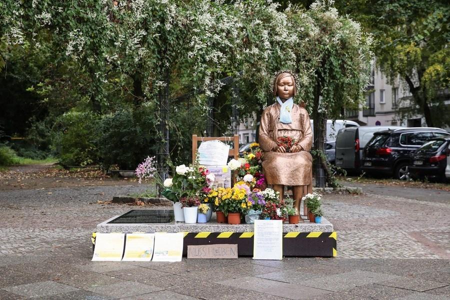 Photo taken on Oct. 15, 2020 shows a "comfort women" statue in Berlin, capital of Germany. The statue was built to commemorate the more than 200,000 girls and women from 14 countries and regions, so-called "comfort women," who were sexually enslaved by the Japanese military during World War II. (Xinhua/Shan Yuqi)