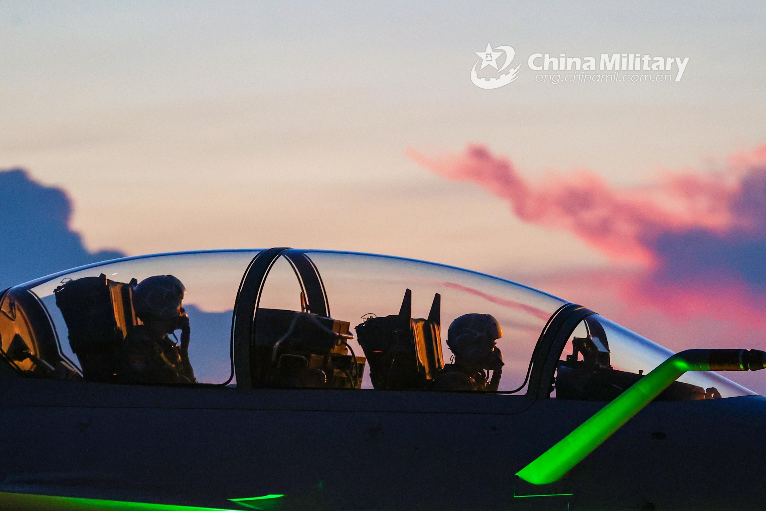 Two well-armed pilots assigned to an aviation brigade of the air force under the PLA Southern Theater Command taxi their fighter jet onto the runway during a round-the-clock flight training exercise on June 16, 2021. (eng.chinamil.com.cn/Photo by Wang Guoyun)