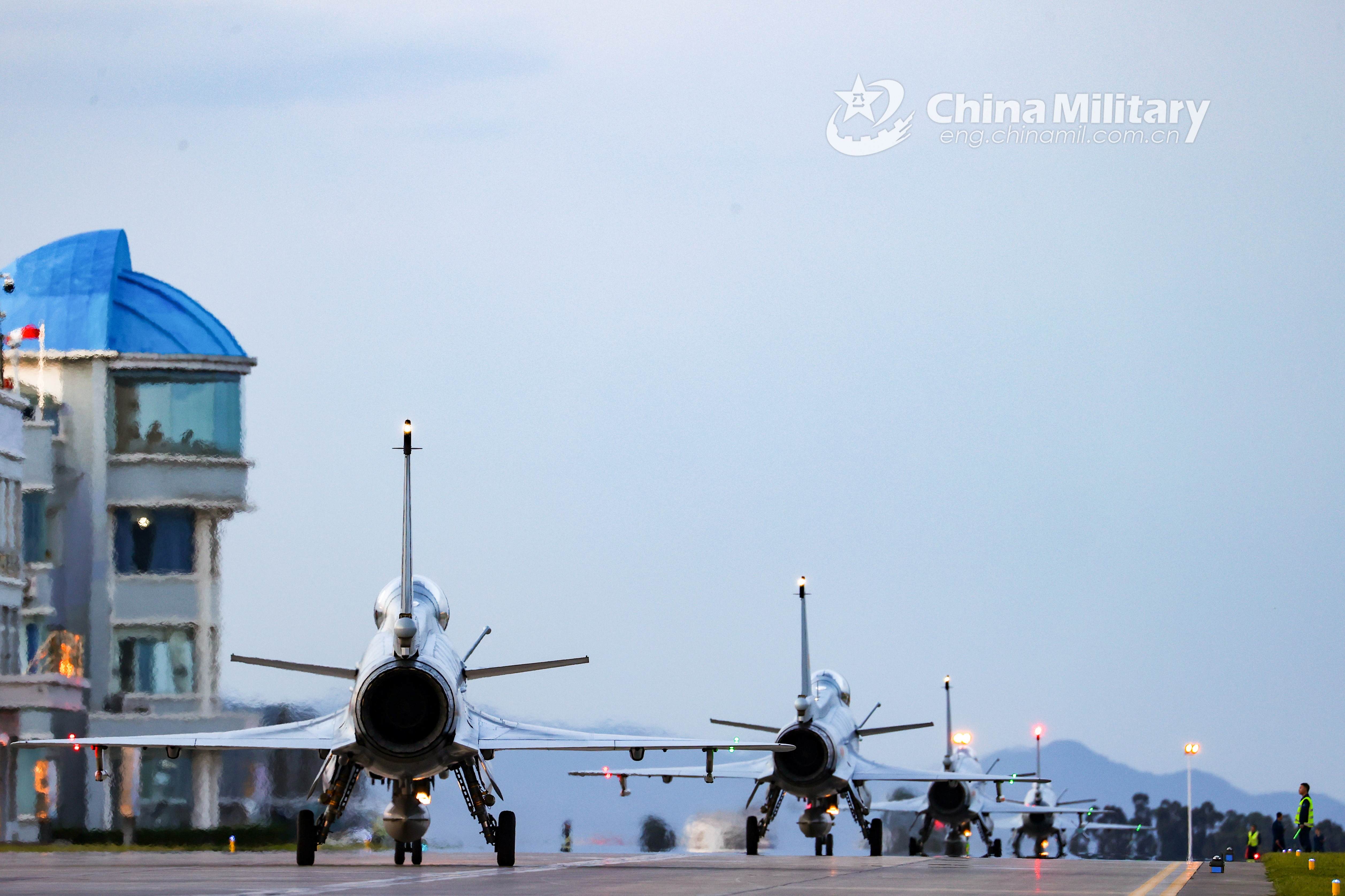 Fighter jets attached to an aviation brigade of the air force under the PLA Southern Theater Command participate in a close formation taxi known as an "elephant walk" along the runway before takeoff during a round-the-clock flight training exercise on June 16, 2021. (eng.chinamil.com.cn/Photo by Wang Guoyun)