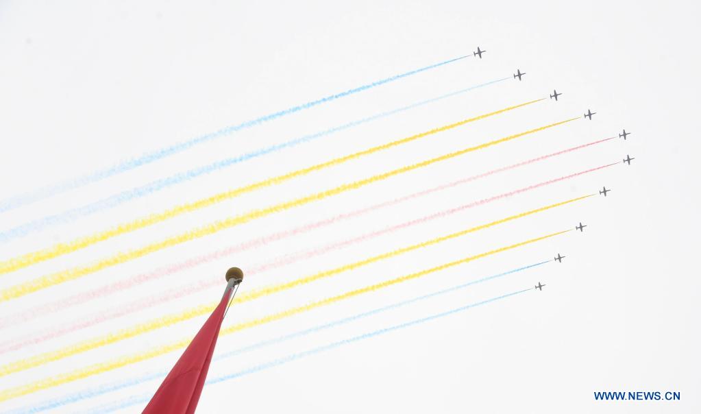 Military aircraft fly in echelon ahead of a grand gathering celebrating the Communist Party of China (CPC) centenary in Beijing, capital of China, July 1, 2021. (Xinhua/Ren Chao)