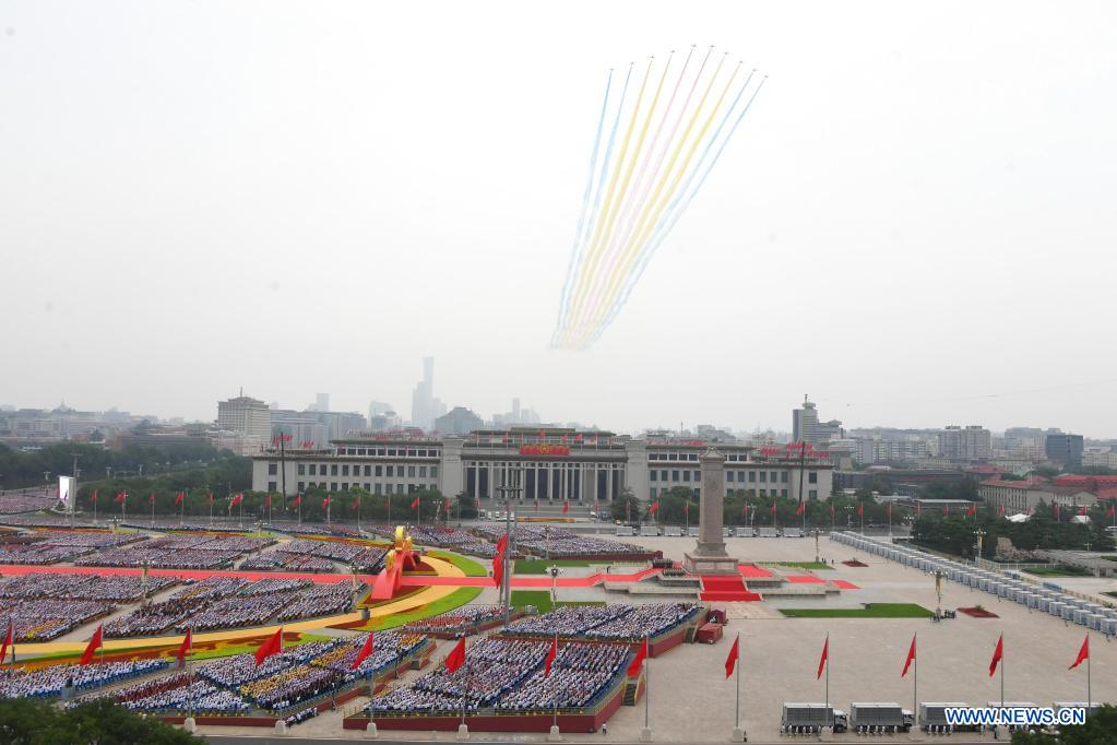 Military aircraft fly over Tian'anmen Square in echelon ahead of a grand gathering celebrating the Communist Party of China (CPC) centenary in Beijing, capital of China, July 1, 2021. (Xinhua/Ren Chao)