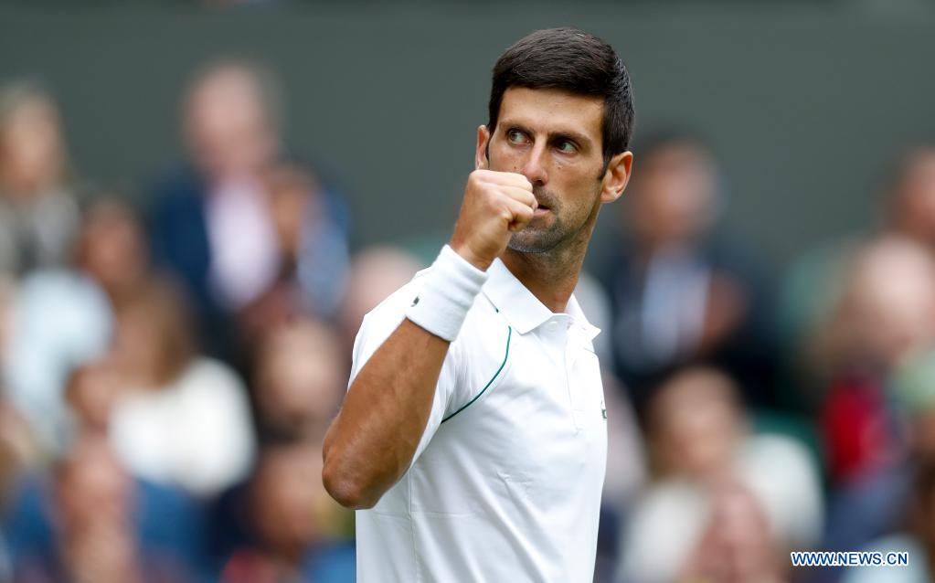Novak Djokovic of Serbia reacts during the men's singles second round match between Novak Djokovic of Serbia and Kevin Anderson of South Africa at Wimbledon tennis Championship in London, Britain, on June 30, 2021. (Xinhua/Han Yan)