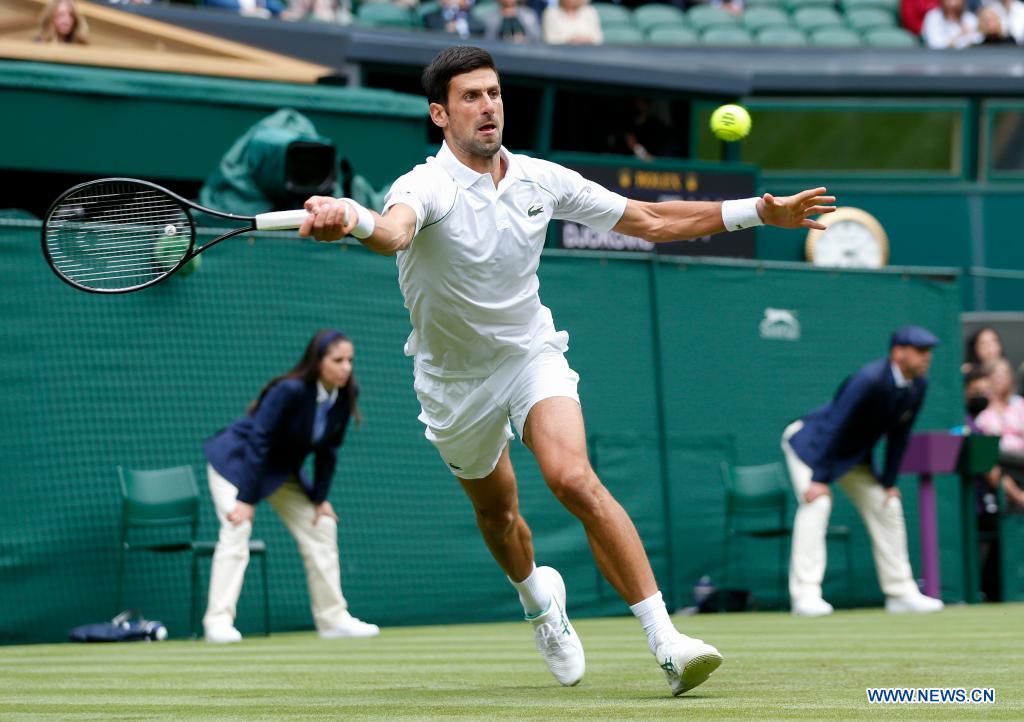 Novak Djokovic of Serbia competes during the men's singles second round match between Novak Djokovic of Serbia and Kevin Anderson of South Africa at Wimbledon tennis Championship in London, Britain, on June 30, 2021. (Xinhua/Han Yan)