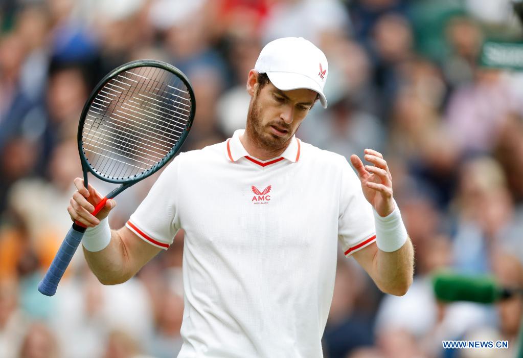 Andy Murry of Britain reacts during the men's singles second round match between Oscar Otte of Germany and Andy Murry of Britain at Wimbledon tennis Championship in London, Britain, on June 30, 2021. (Xinhua/Han Yan)