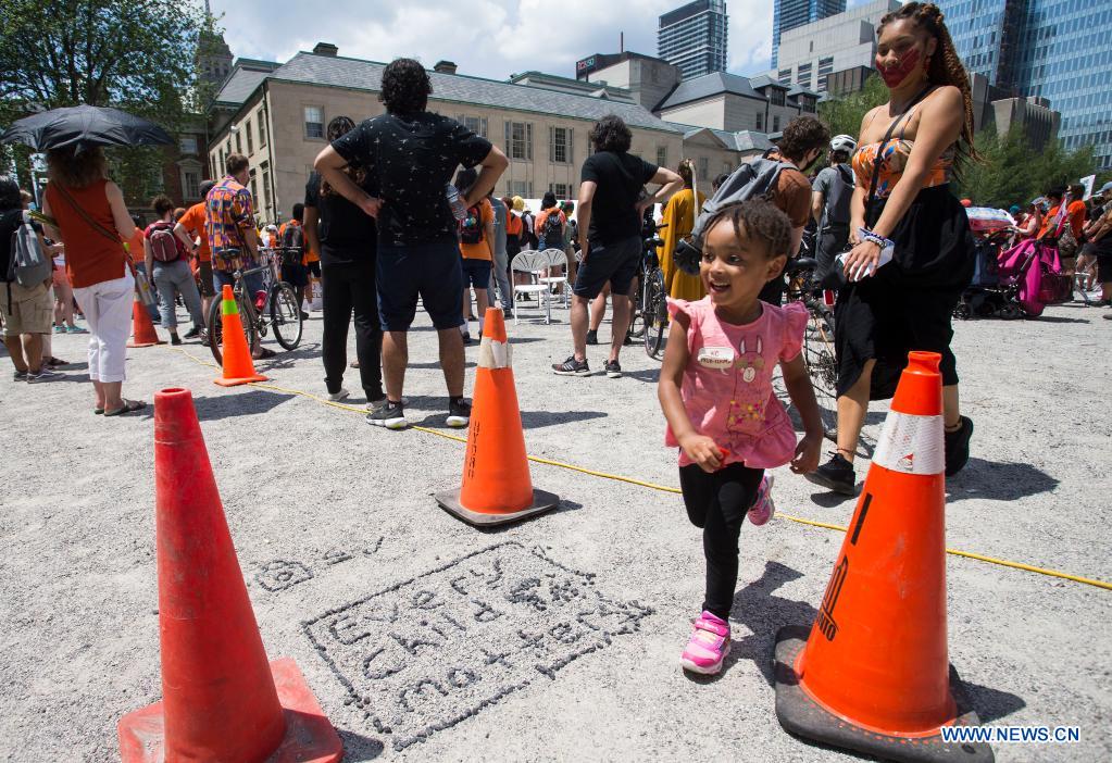 A girl runs past a "Every Child Matters" sign on the ground during a rally in Toronto, Canada, on July 1, 2021. Hundreds of people gathered here on Thursday to pay tribute to indigenous children whose bodies were found in mass graves near former indigenous residential schools in Canada. (Photo by Zou Zheng/Xinhua)
