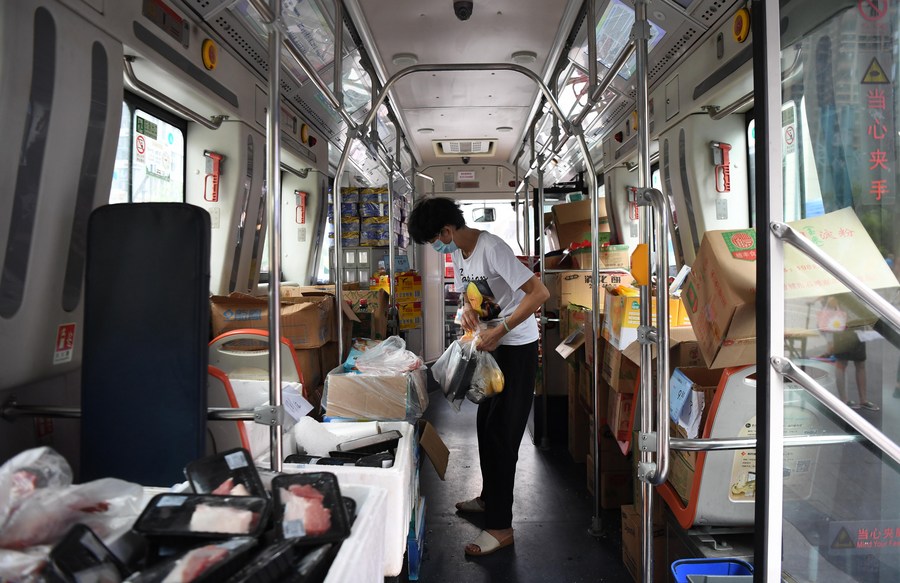 A resident shops at a bus-based mobile market in Liwan District of Guangzhou, south China's Guangdong Province, June 19, 2021. Guangzhou has recently launched a bus-based mobile shopping service, which sends food and daily necessities to the city's risk areas by bus, making it easier for the citizens under epidemic control to shop at their residential areas. (Xinhua/Deng Hua)