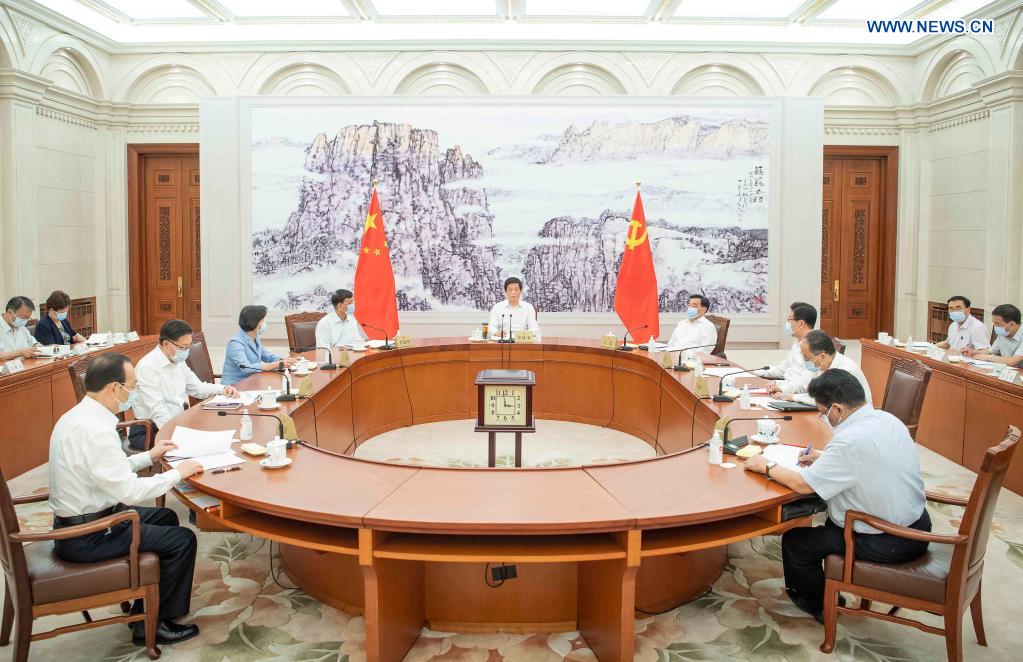 Senior Chinese legislators meet to study an important speech by Xi Jinping, general secretary of the Communist Party of China (CPC) Central Committee, at the ceremony marking the centenary of the CPC, in Beijing, capital of China, July 1, 2021. The meeting of the leading Party members group of the Standing Committee of the National People's Congress (NPC), China's top legislature, was presided over by Li Zhanshu, a member of the Standing Committee of the Political Bureau of the CPC Central Committee, chairman of the NPC Standing Committee, and secretary of its leading Party members group. Li delivered a speech at the meeting. (Xinhua/Li Tao)