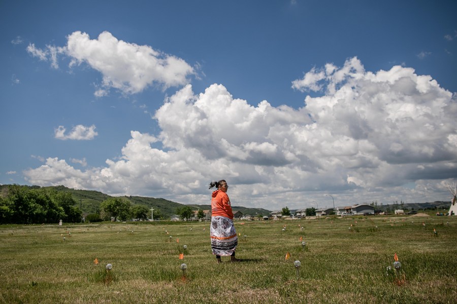 A member of the Cowessess First Nation stands at the site of unmarked graves near a former indigenous residential school in Saskatchewan, Canada, on June 27, 2021. (Photo by Amru Salahuddien/Xinhua)