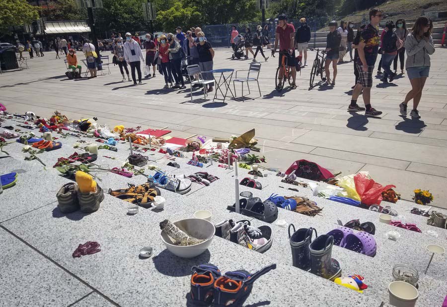 Children's shoes are placed on the staircase outside Vancouver Art Gallery during a memorial event for the 215 children whose remains have been found buried at a former Kamloops residential school in Vancouver, British Columbia, Canada, May 29, 2021. (Photo by Liang Sen/Xinhua)