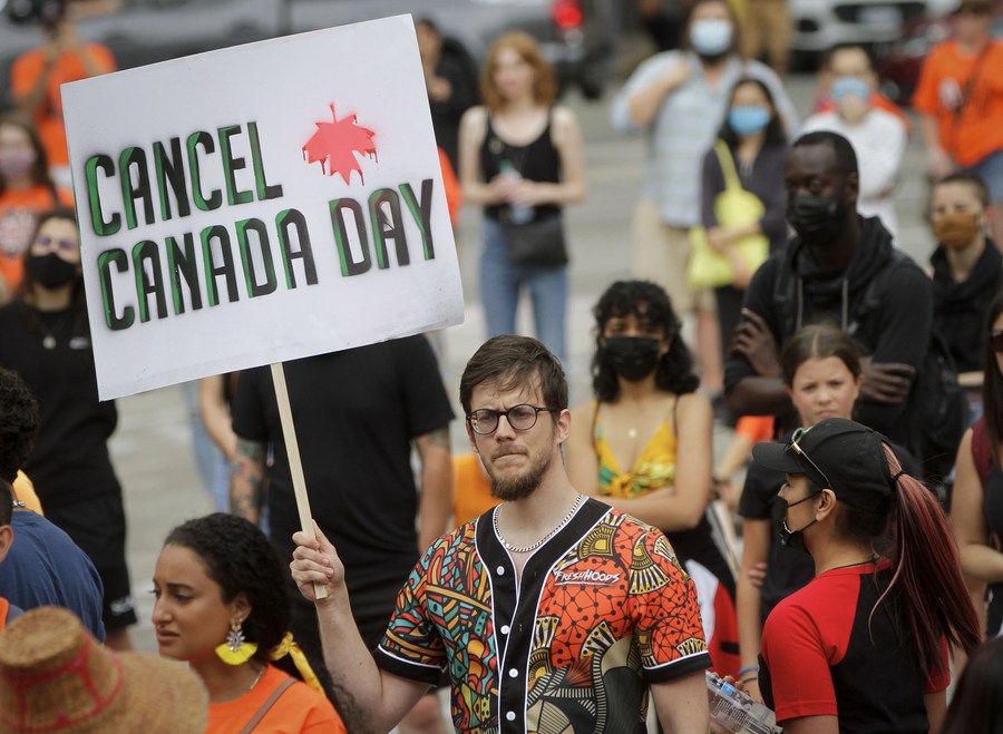 A participant holds a sign during a "Cancel Canada Day" rally in Vancouver, Canada, July 1, 2021. (Photo by Liang Sen/Xinhua)
