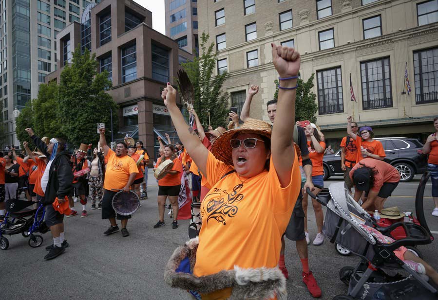 Members of the indigenous community participate in a "Cancel Canada Day" rally in Vancouver, Canada, July 1, 2021. (Photo by Liang Sen/Xinhua)