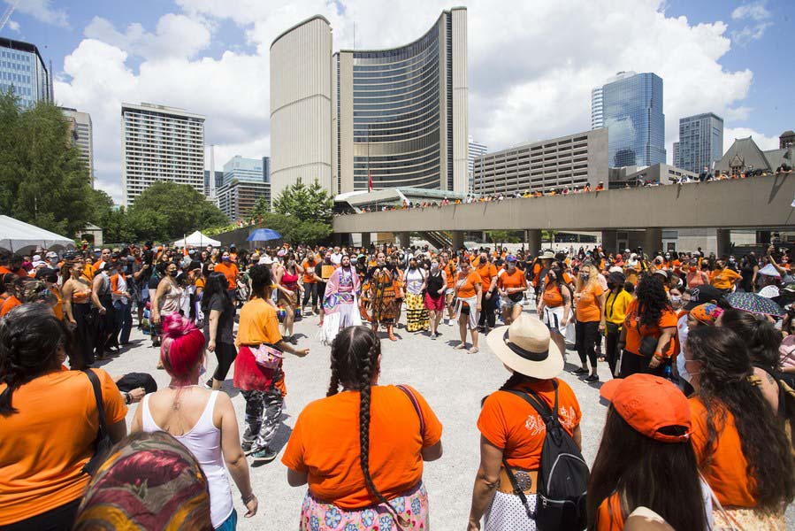 People take part in an event to mourn for victims who died of abuses by former indigenous residential schools in Toronto, Canada, on July 1, 2021. (Photo by Zou Zheng/Xinhua)
