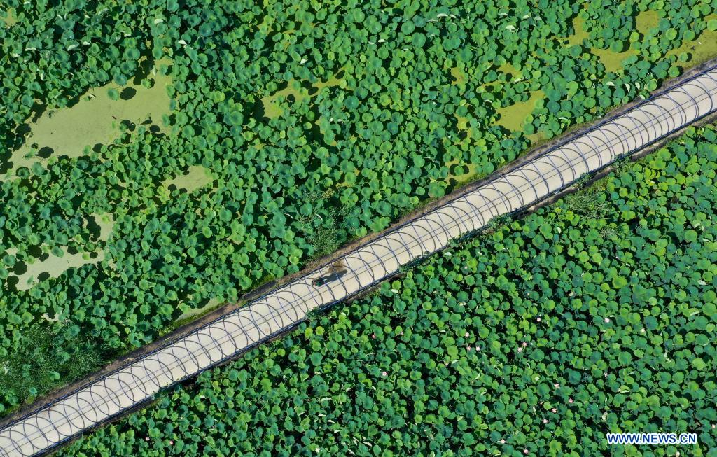 Aerial photo taken on July 3, 2021 shows the lotus ponds in Suma Village of Baiyunhu in Jinan, east China's Shandong Province. (Xinhua/Zhu Zheng)