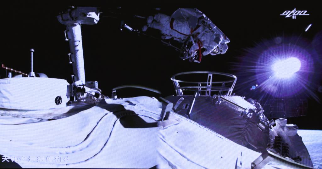 Screen image taken at Beijing Aerospace Control Center on July 4, 2021 shows a Chinese astronaut conducting extravehicular activities (EVAs) out of the space station core module Tianhe. (Xinhua/Jin Liwang)