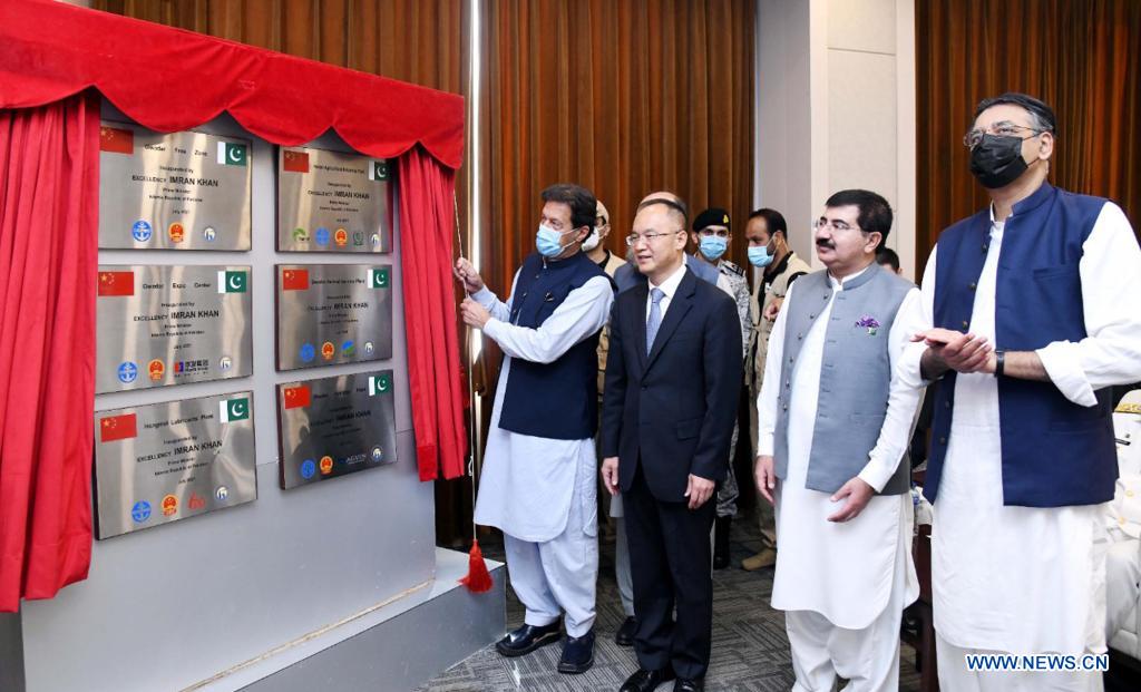 Pakistani Prime Minister Imran Khan (1st L) unveils project plates during a groundbreaking ceremony of several projects in Gwadar, Pakistan, on July 5, 2021. Imran Khan said Monday that his country can benefit from Chinese expertise for development and economic stability as China has achieved rapid development and is getting stronger with each passing day. (Pakistani Press Information Department/Handout via Xinhua)