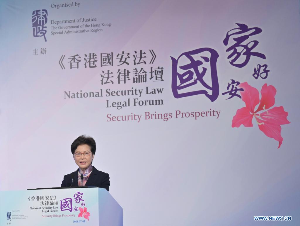 Carrie Lam, Chief Executive of the Hong Kong Special Administrative Region (HKSAR), addresses a forum entitled "National Security Law Legal Forum -- Security Brings Prosperity" in south China's Hong Kong, July 5, 2021. (Xinhua)