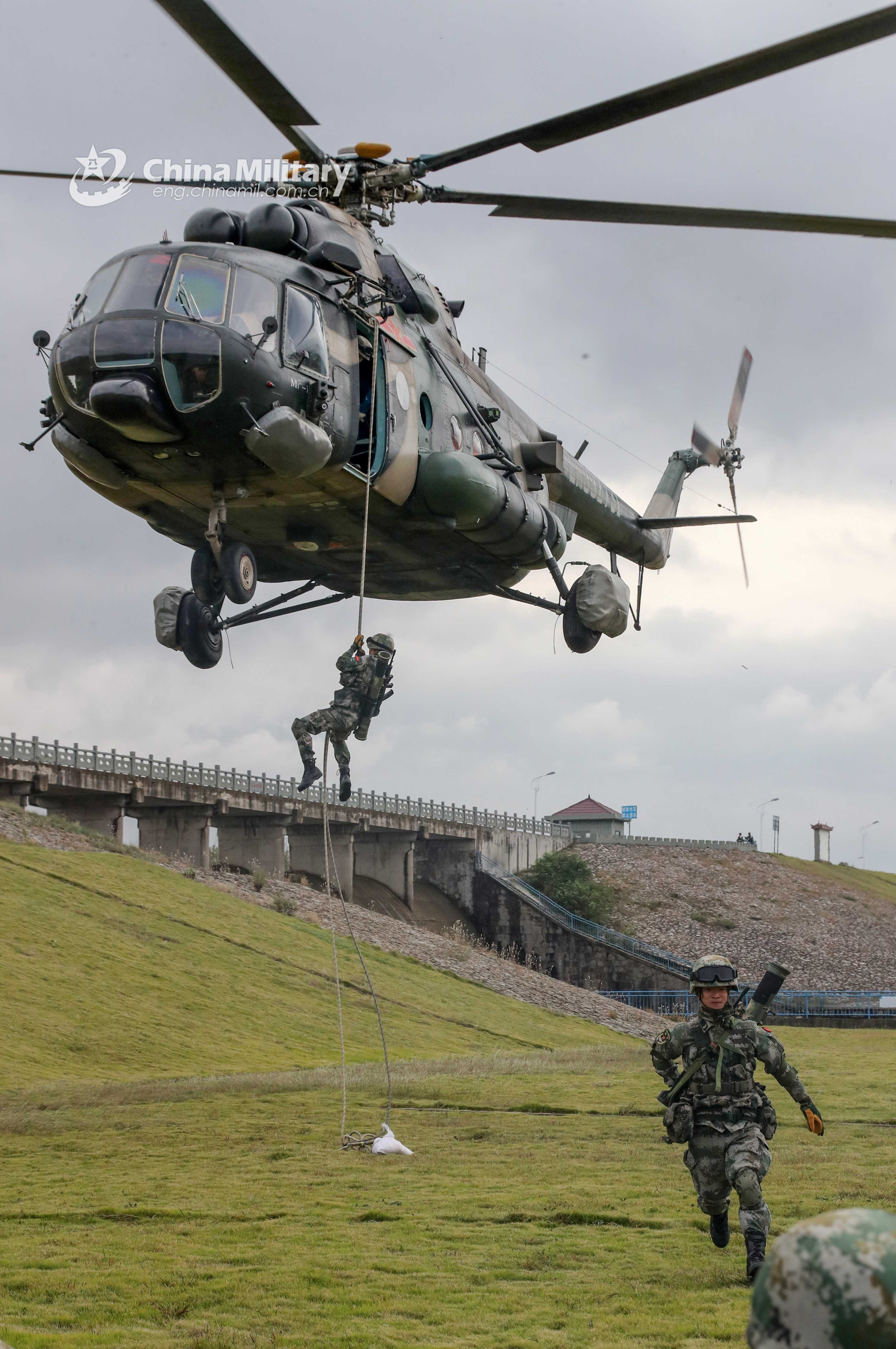 Soldiers assigned to an army aviation brigade under the PLA 71st Group Army practice exiting a transport helicopter during a night fast-roping exercise on June 18, 2021. (eng.chinamil.com.cn/Photo by Zhang Mao)