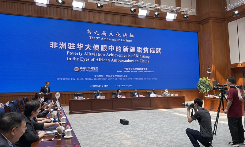 Ambassadors and diplomats of African countries attended a forum in Beijing on Tuesday to share their stories of visiting Northwest China's Xinjiang Uygur Autonomous Region and their understanding of the poverty alleviation achievements in the region, criticizing some Western countries and the US for hyping untenable accusations against Xinjiang and even escalating their smears to so-called "genocide" in an attempt to thwart China's development.