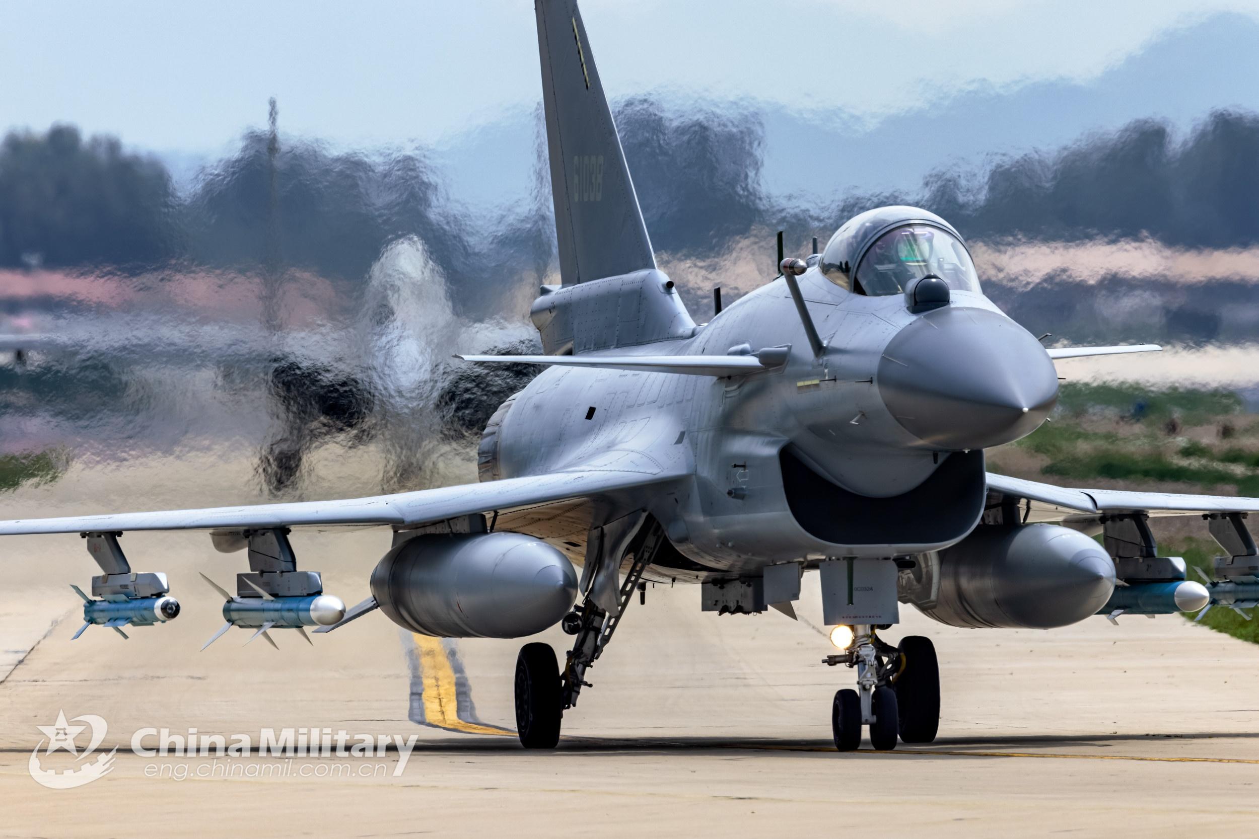 Fighter jets attached to an aviation brigade under the PLA Northern Theater Command taxi on the flightline before takeoff during a flight training exercise on June 23, 2021. (eng.chinamil.com.cn/Photo by Yang Pan)