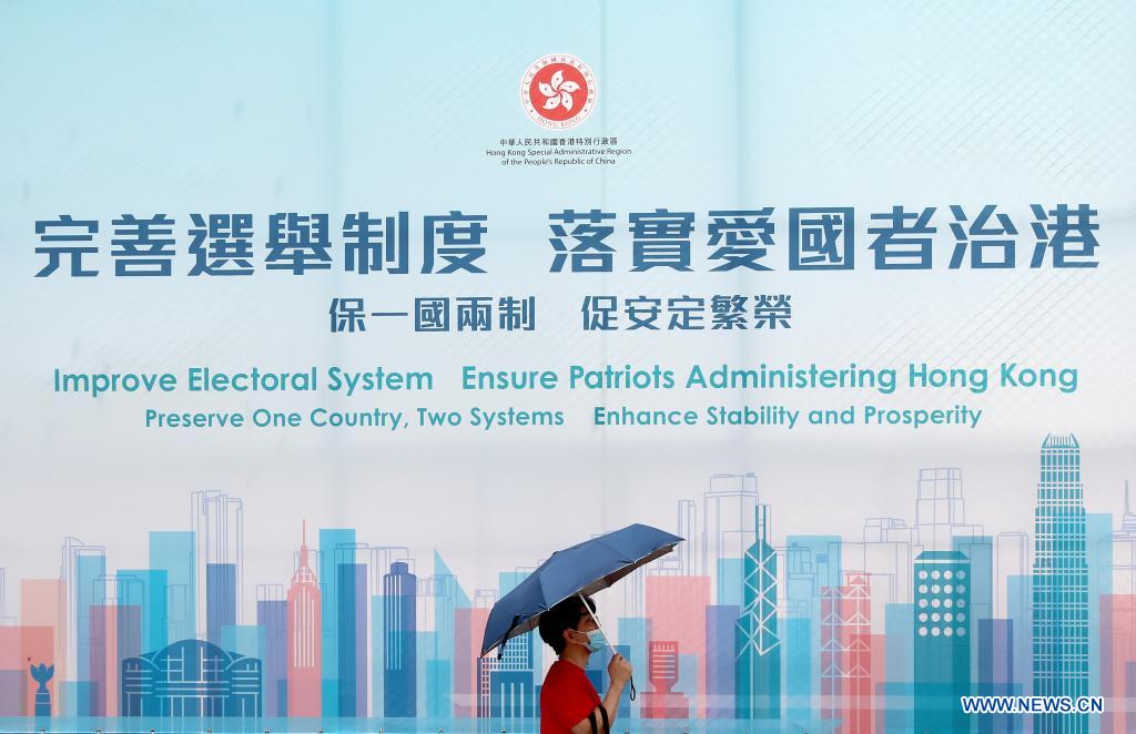 A pedestrian walks past a poster on improving electoral system and ensuring patriots administering Hong Kong in south China's Hong Kong, March 31, 2021. (Xinhua/Wu Xiaochu)